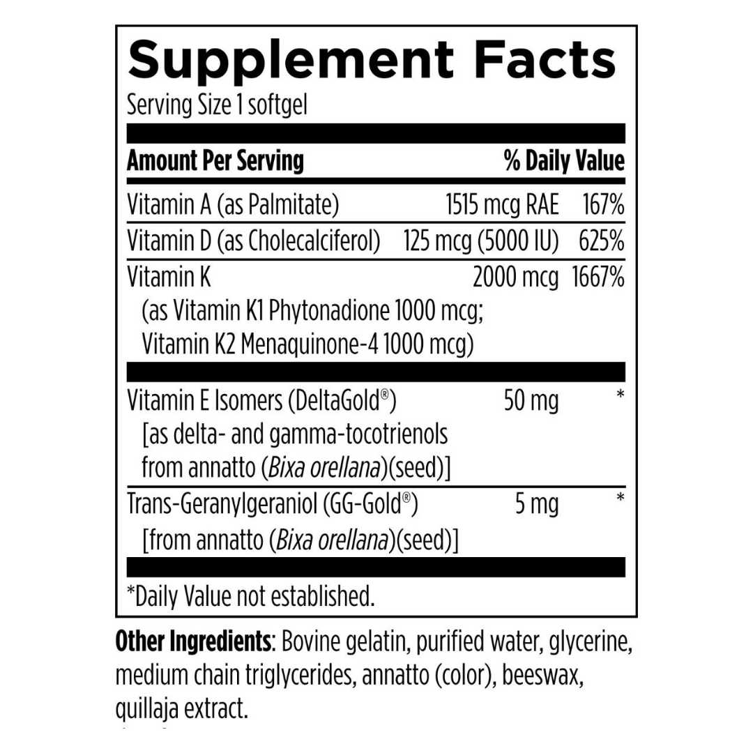 Formulated with a synergistic combination of vitamins A, D, K and vitamin E isomers. Optimal delivery system for necessary fat soluble vitamins for enhanced absorption and bioavailability.