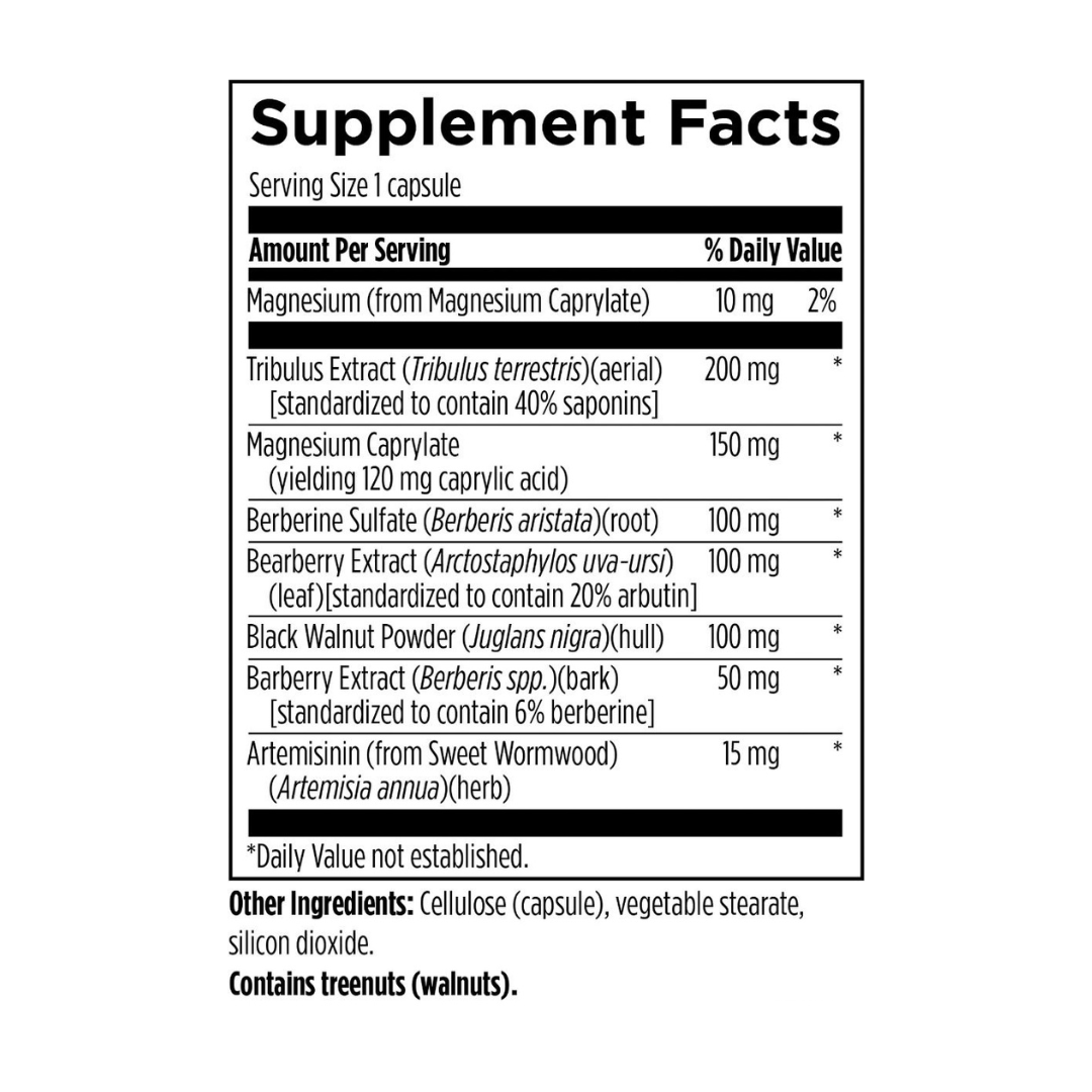 Formulated with potent plant extracts, such as tribulus extract, berberine, bearberry extract, black walnut powder, barberry extract, and artemisinin, along with magnesium and caprylic acid from magnesium caprylate, which have a long history of traditional use in supporting a healthy balance of microorganisms in the gastrointestinal tract. Scientific research has suggested that the active components in these botanical extracts may also possess antimicrobial, antiviral, and anti-parasitic properties.*