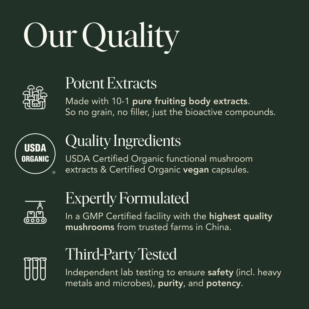 The capsules are made exclusively from 100% organic mushroom fruiting body extracts and have no fillers, ensuring a pure, high-quality source of bioactive compounds.