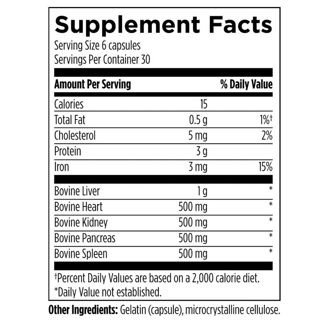 Formulated with a targeted blend of five different grass-fed bovine organs, including the liver, heart, pancreas, kidney, and spleen.