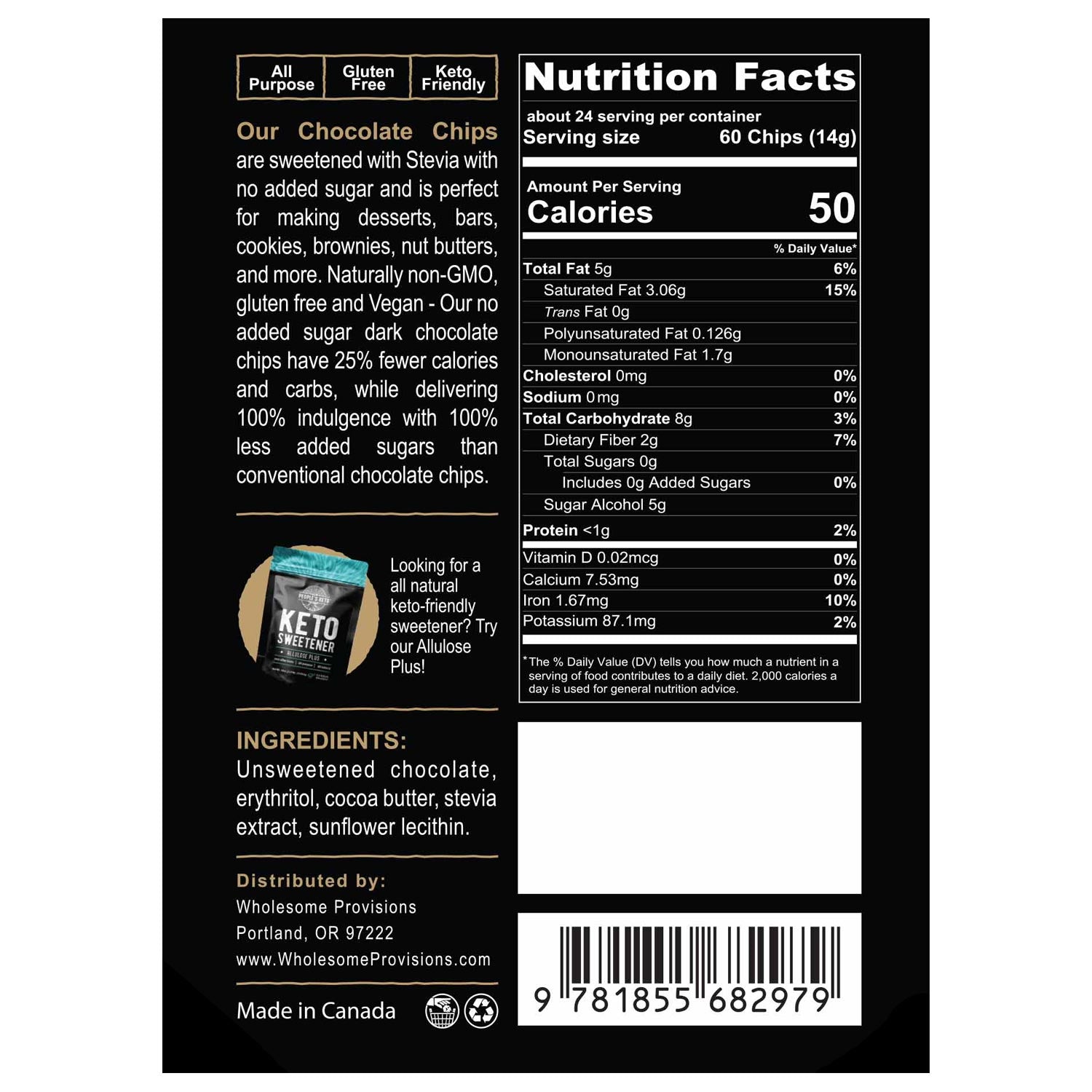 EXCELLENT NUTRITIONAL PROFILE: Wholesome Provisions chocolate chips have 25% fewer calories and carbs than conventional chocolate chips! Only 50 calories per serving.
